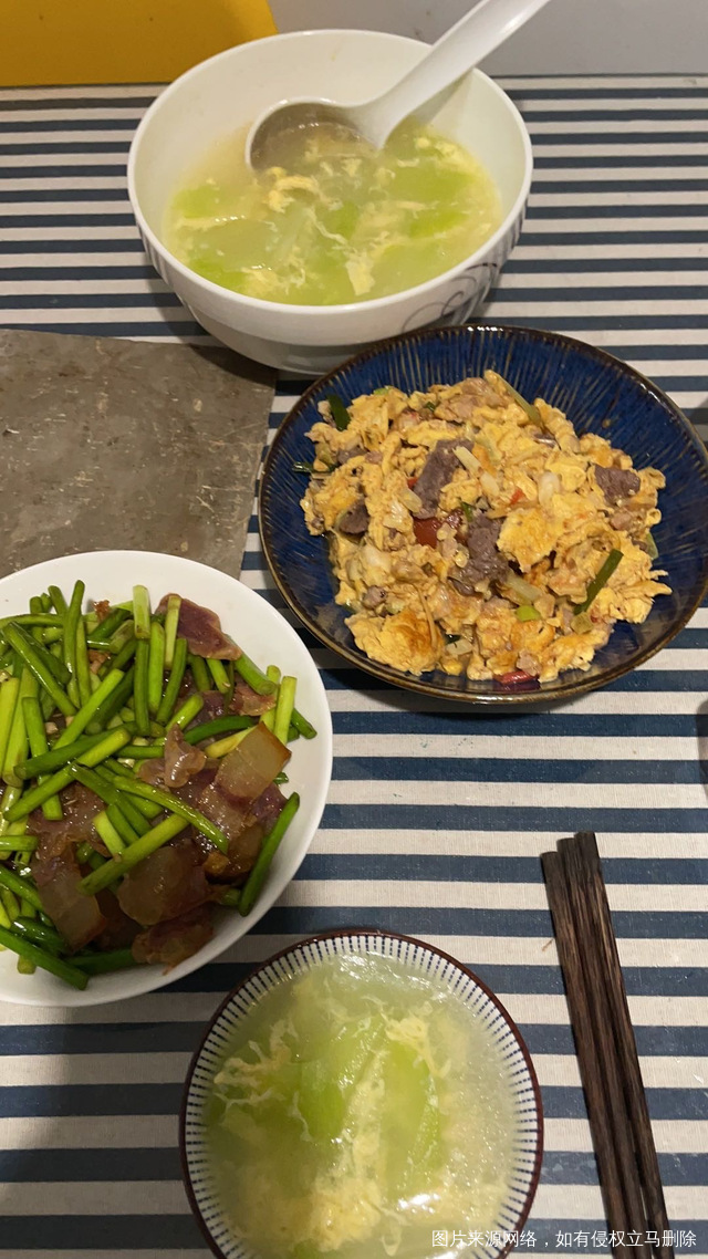 晚饭,节瓜汤+粗粮饭+炒蛋+腊肉炒蒜苔