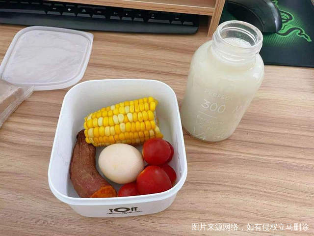 早餐牛奶一杯,玉米半根,鸡蛋一个,红薯一个