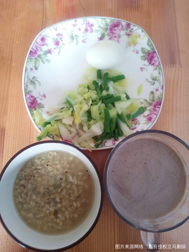 豆浆,燕麦和藜麦粥,水煮菜,煮鸡蛋