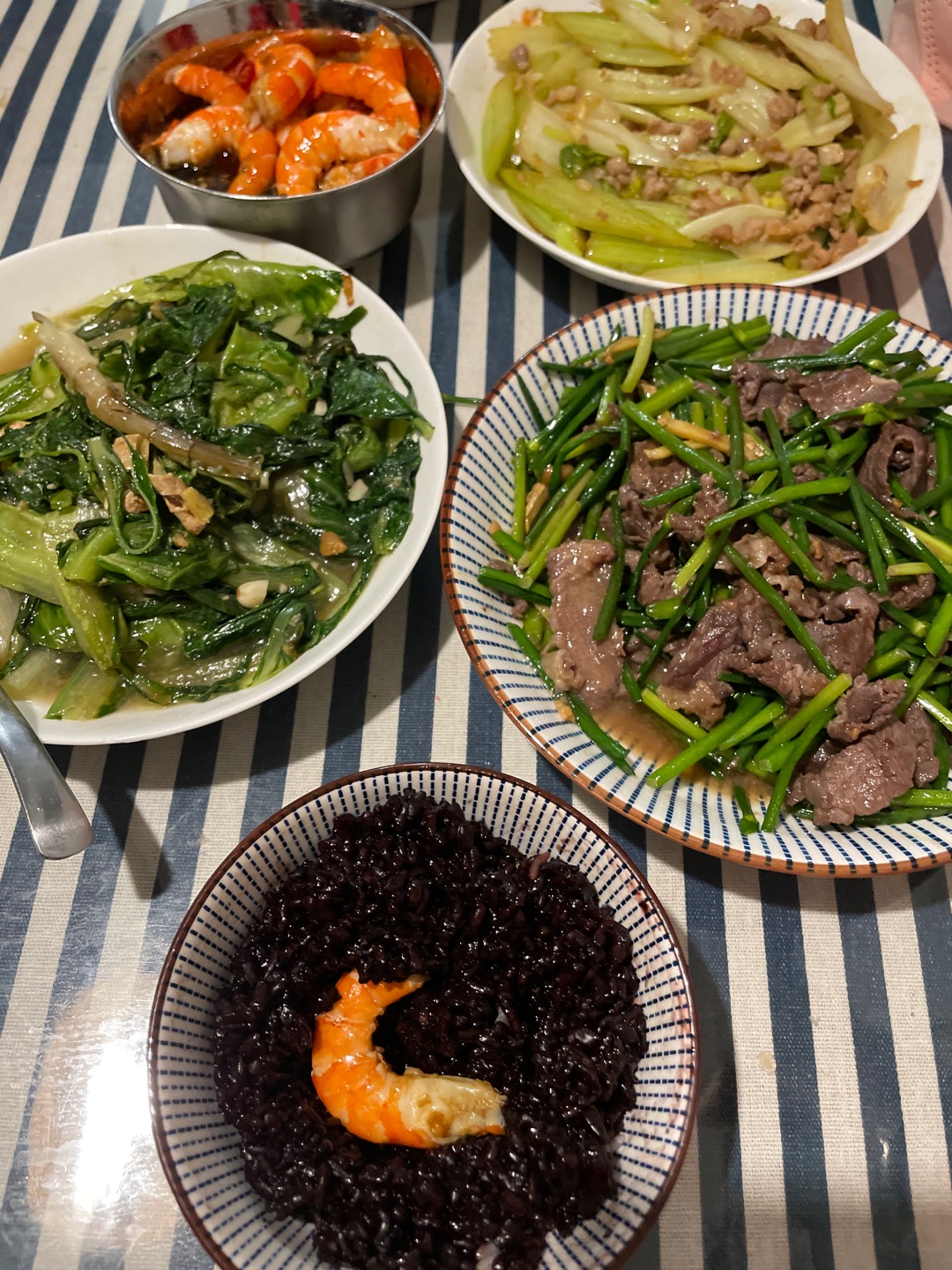 #第5天# 晚餐:半碗黑米饭+牛肉炒韭菜花+芹菜肉沫+青菜+虾