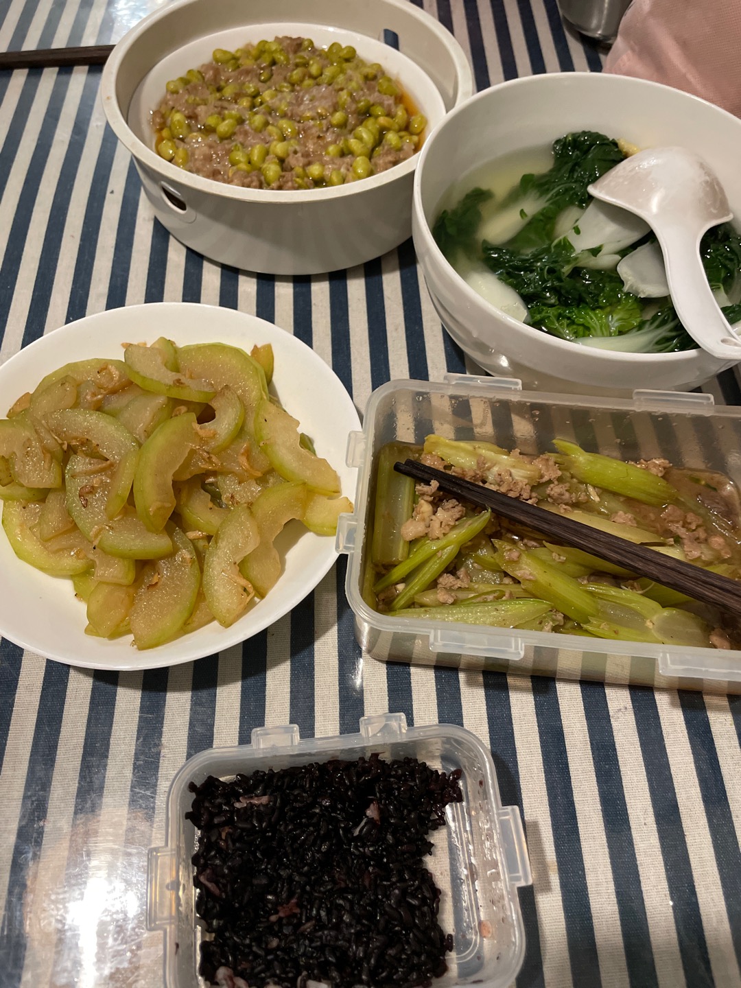 #第6天# 晚餐:半碗黑米饭+炒节瓜+青菜+豆青蒸肉饼