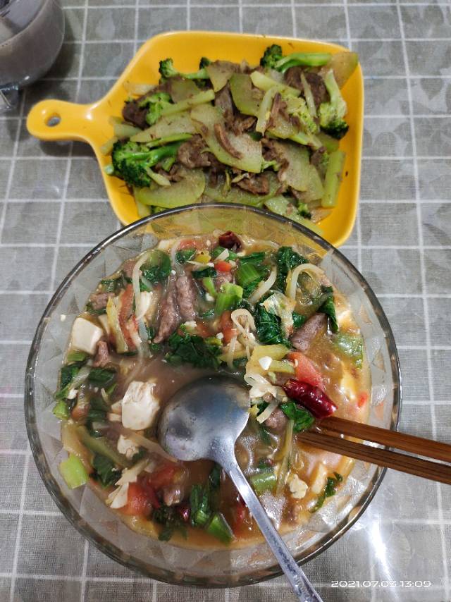早,黑豆浆一杯+黄瓜。午,蔬菜疙瘩汤+牛肉焖