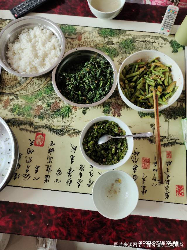 午,米饭+排骨汤+凉拌野菜+豇豆。