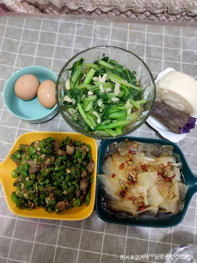 早,半个馒头+一盘冬瓜+青菜鸡蛋。 午,牛肉