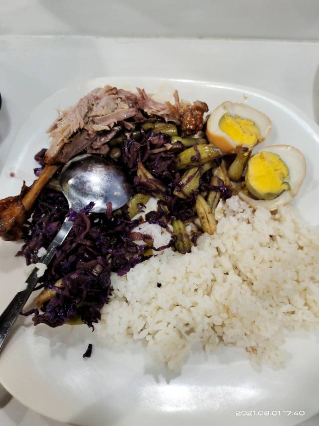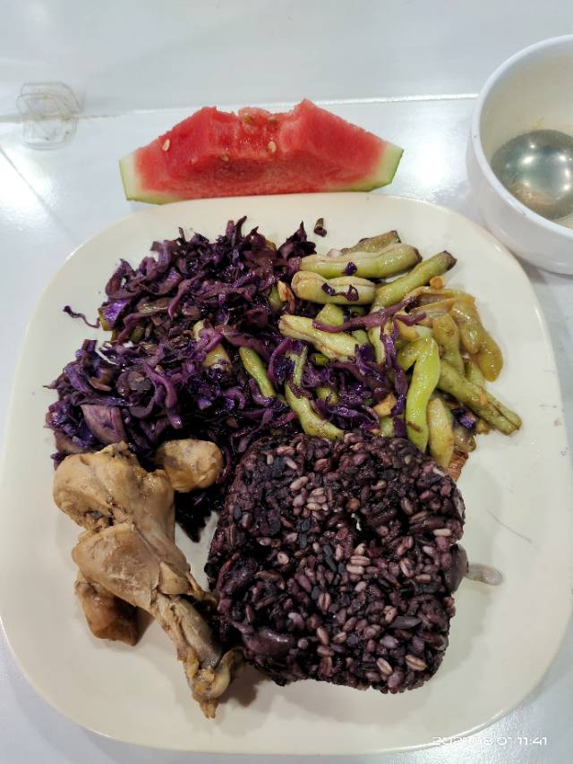 午,杂粮米饭150g+豆角+紫甘蓝+卤鸡腿。
