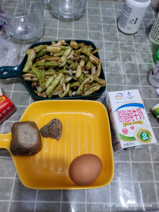 早点,清炒豆角+鸡蛋牛奶+两个全麦馒头。 午