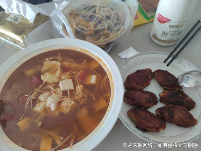 打卡今天的中饭,鸡翅,凉拌菜,豆腐汤。