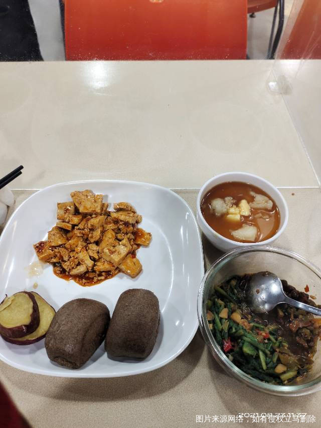 午,豆腐+蒸鸡蛋+红薯+馒头一个+菜。