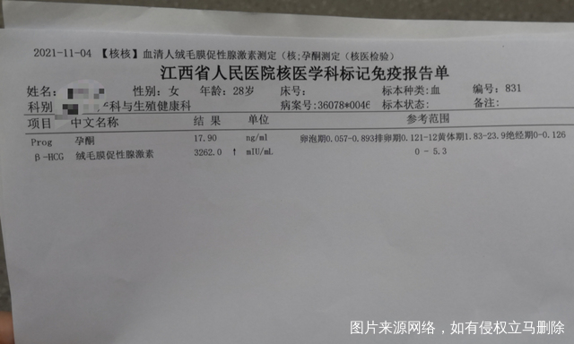 2021年11月4日复查,孕酮17.9,hcg3262,宫内见无回声区,回声强,囊内未见孕囊和胚胎胚芽,左侧附件探及回声团,大小月24*24,周边见血流信号。