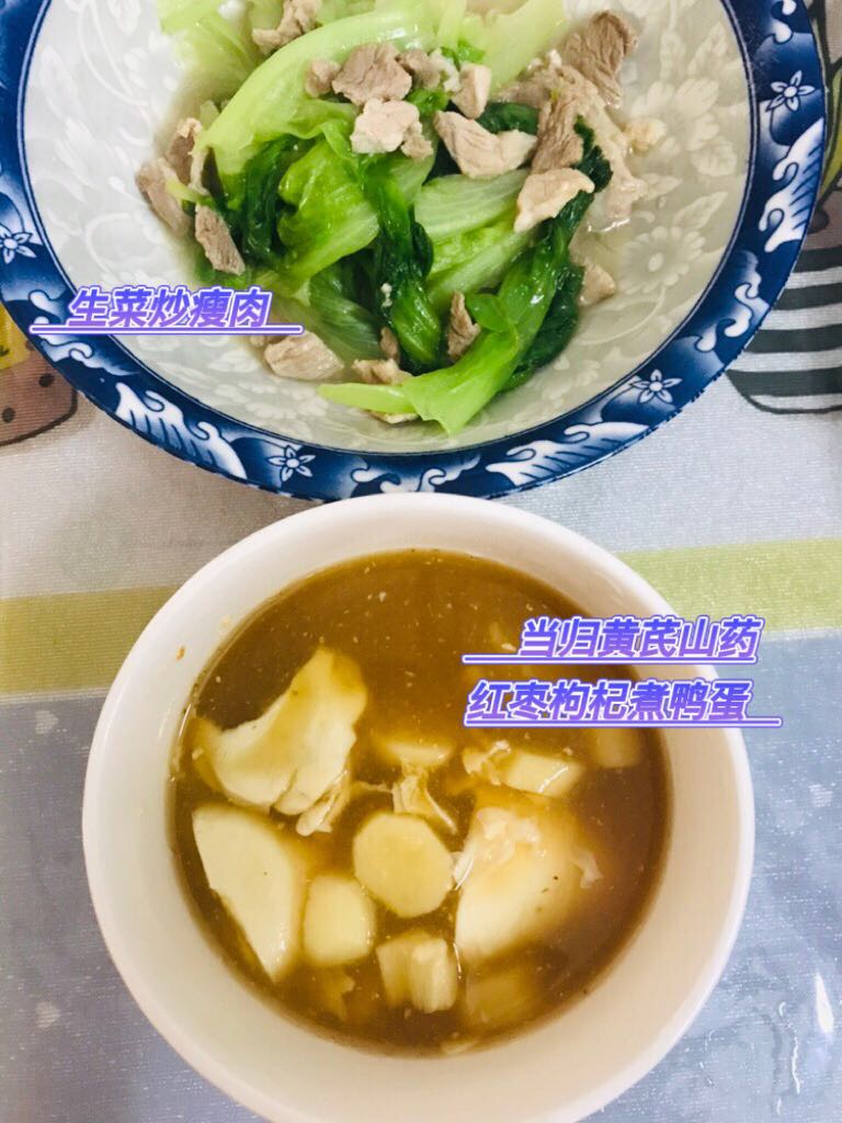 #第1天# 1。打卡:生菜炒瘦肉+葯膳汤