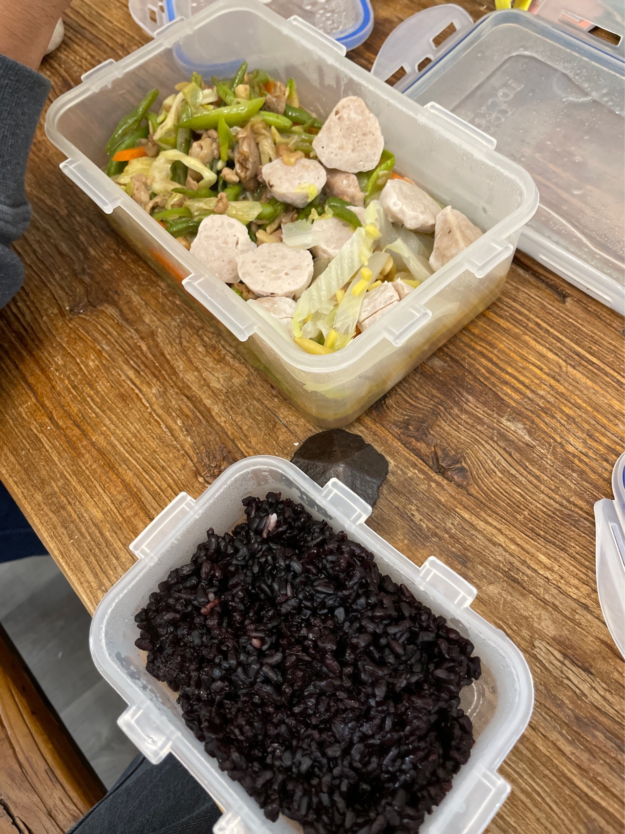 #第3天# 午餐带黑米饭和炒四季豆,炒西葫芦