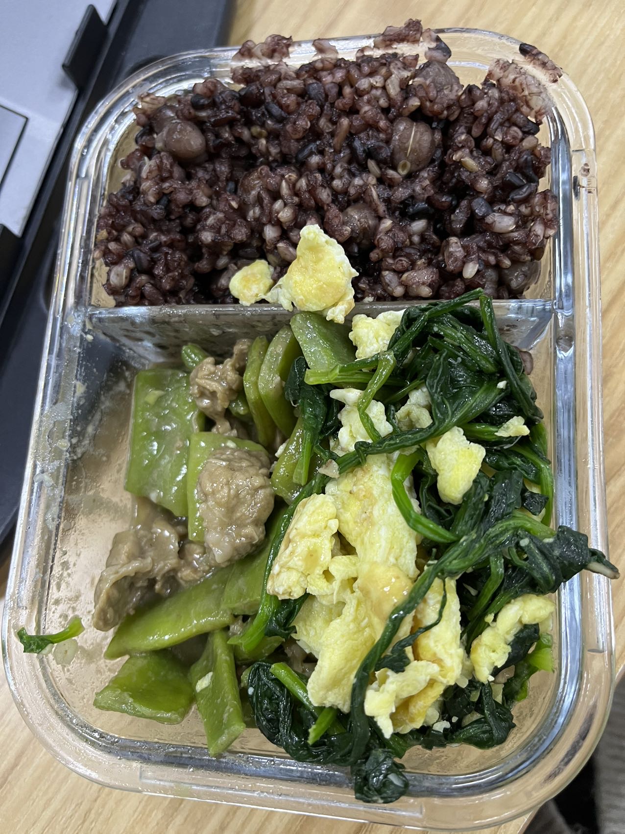 今日午餐,三色米,牛肉,鸡蛋菠菜