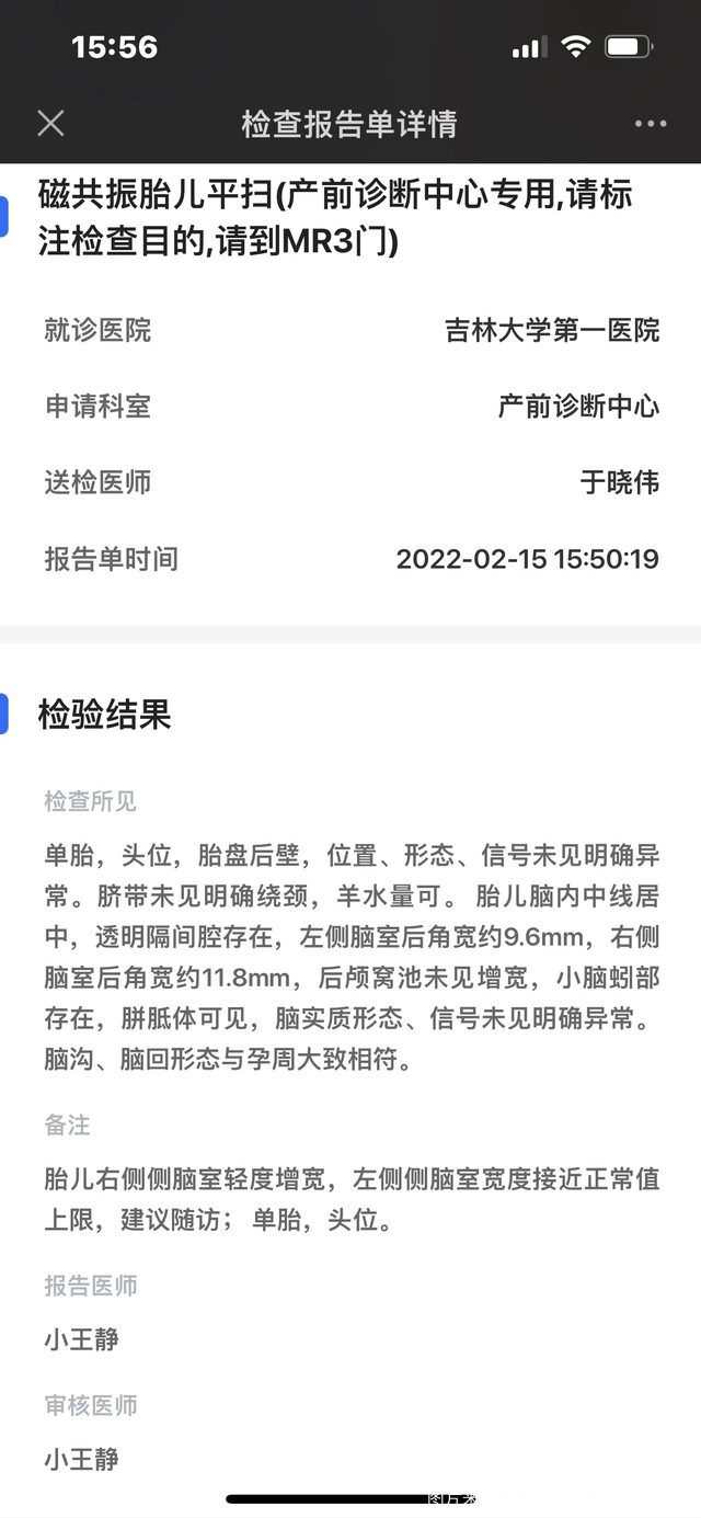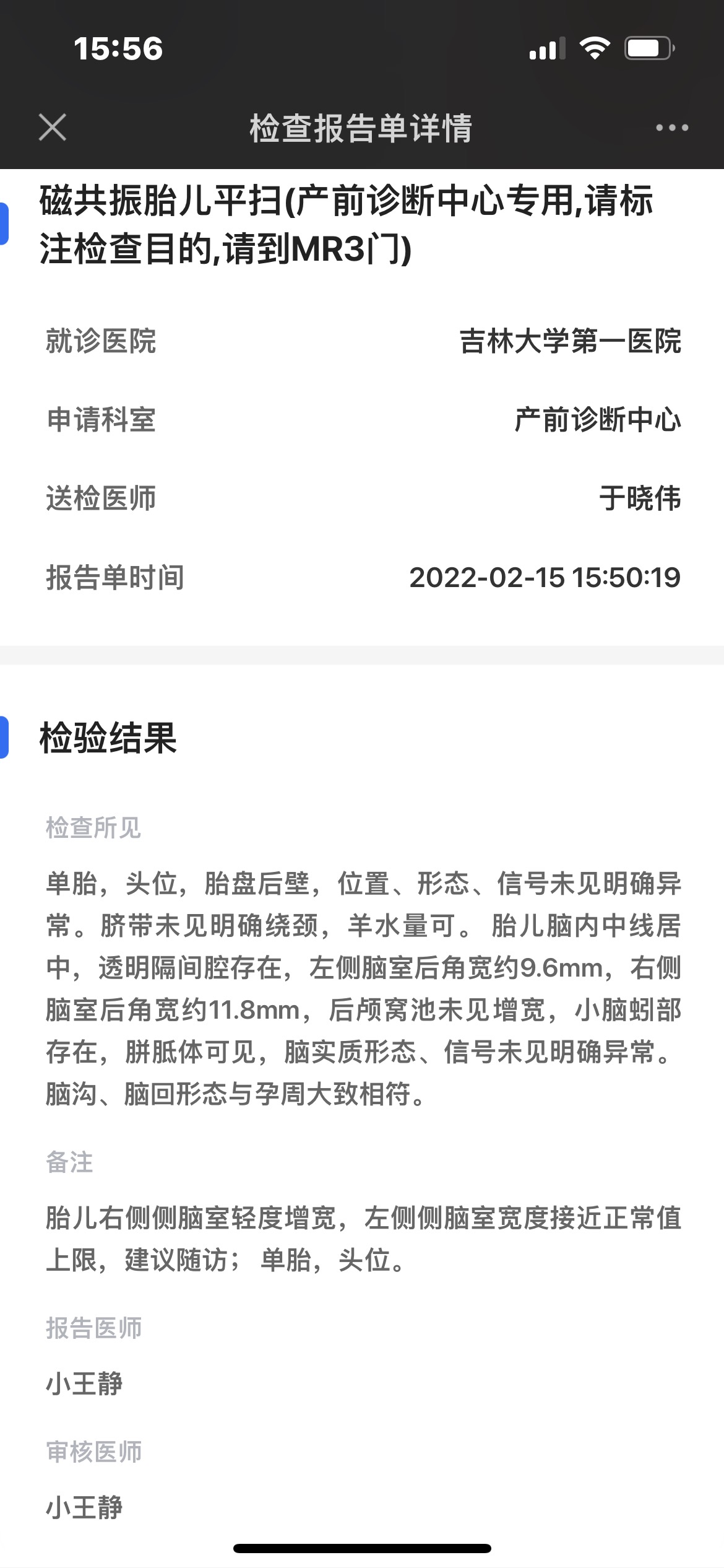 孕35周,今天做的胎儿核磁共振。左右侧脑室增宽。这个报告有没有问题?希望医生帮我看一下。我真的很担心害怕。谢谢