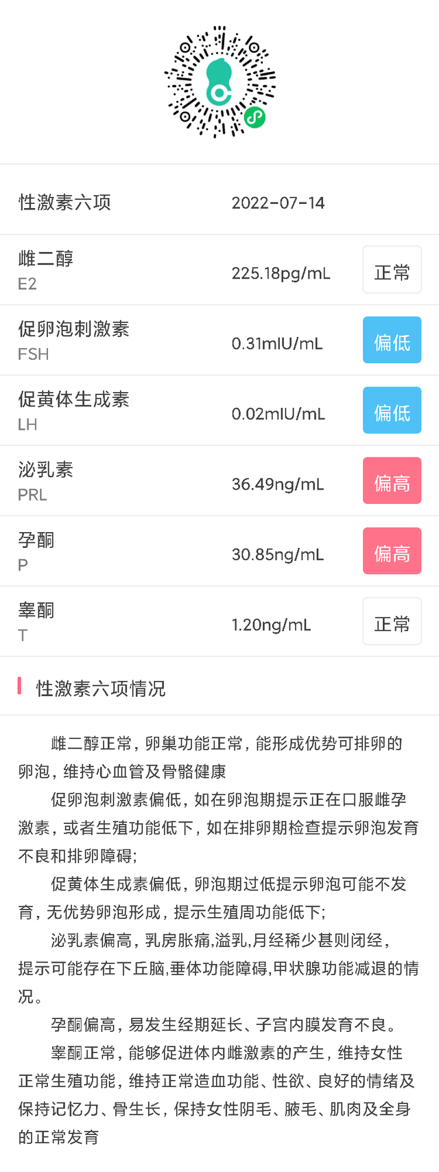 末次月经6.7,24号卵泡13*11,应该是月底排的卵,昨天抽血查了激素六项,这些数值正常吗