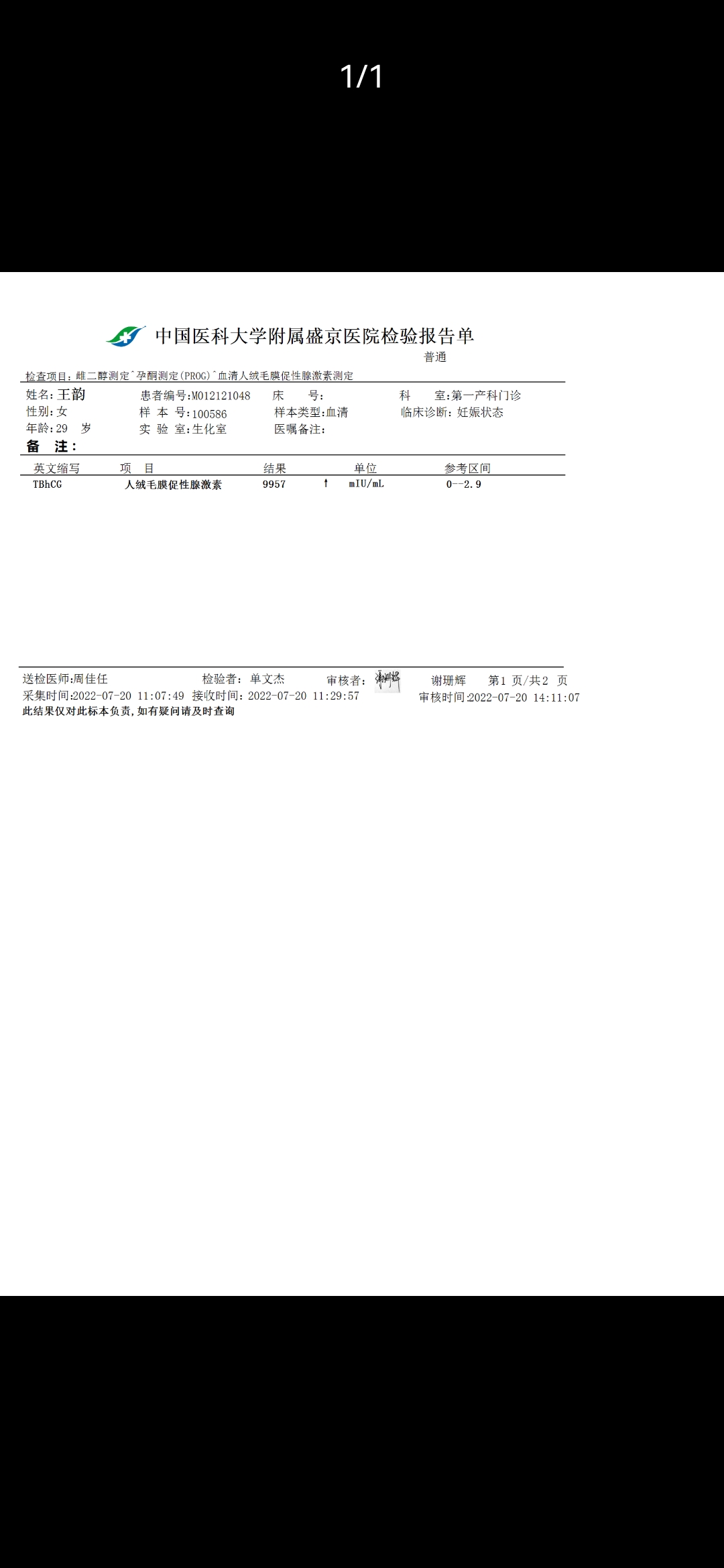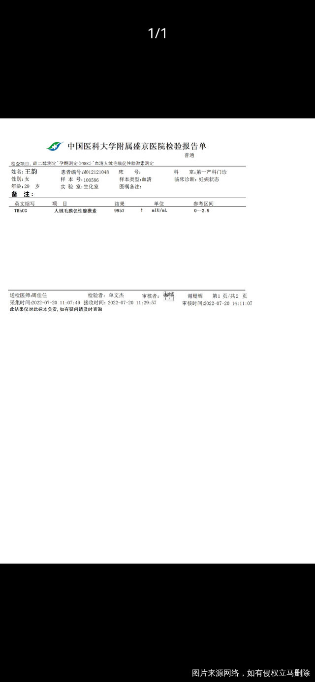 末次月经6.3号,6.26号排卵。7.20号抽血的结果,不知道该说几周,结果有问题吗?