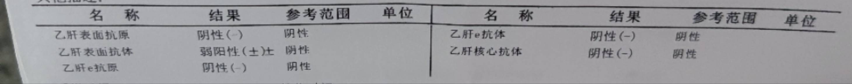 查了乙肝的,产生了乙肝表面抗体是好的,其余全是阴性。亲,正常的呢