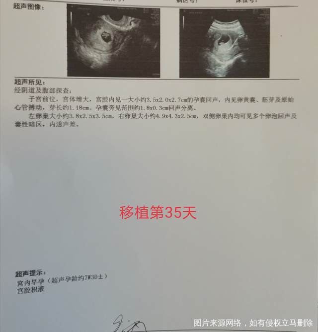 第35天,做阴超时探头一进去,医生说塞过药照不清,然后做腹超,但是为了做阴超小便都排空了,做腹超不是要憋尿的吗,难怪不是很清。