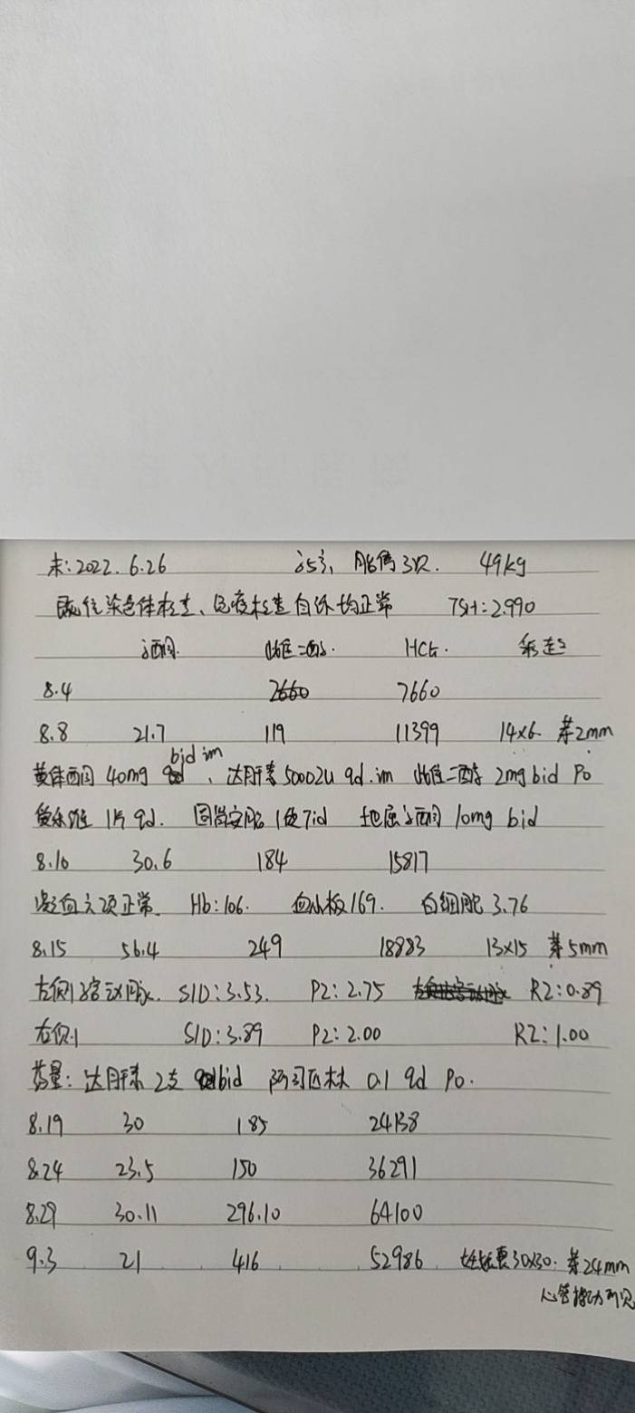 29岁,49kg,三次胎停史,既往检查染色体,免疫方面无明显异常,第一次怀孕是抽老公的血,打的抗体封闭,后面几次怀孕因为用不了抗体封闭治疗,都没看到胎心就自然流产了,这次怀孕末次月经2022.6.30,甲状腺功能正常,8.4号抽血HCG7660mlu/ml,8.8号孕酮21.7ng/ml,雌二醇119pg/ml,Hcg11399,阴超妊娠囊14*6,胎芽2mm,原始心管搏动隐约可见,给与黄体酮注射液40mgbid肌注,达肝素5000iu注射,雌二醇2mgbidpo,爱乐维一天一片,固肾安胎丸一天三次,一次一袋,地屈孕酮片一天两次,一次一粒。后面查凝血、DD聚体正常,HCG翻倍慢,8.15号查子宫动脉阻力高,达肝素一天两次,一次一支,阿司匹林一天一次,一次100mg。每隔5天复查一次孕酮,雌二醇,hcg,都在翻倍长,但速度慢,9.3号复查,Hcg较前减少了一万一,现在是怎么治疗?