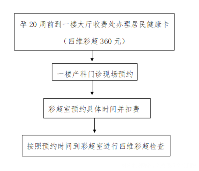 四维彩超预约:孕妇于孕周20周前到妇幼保健院产科门诊进行现场预约。